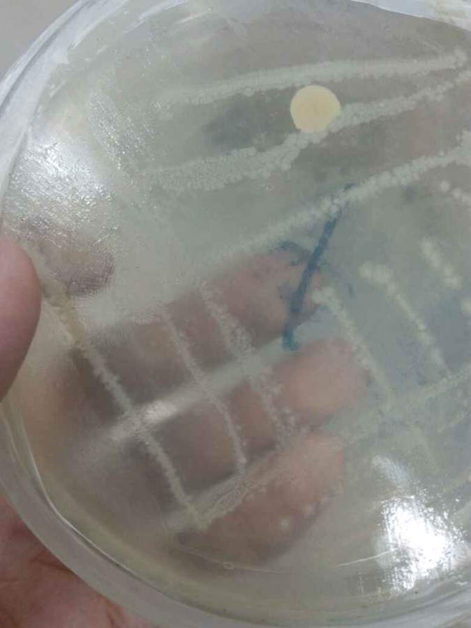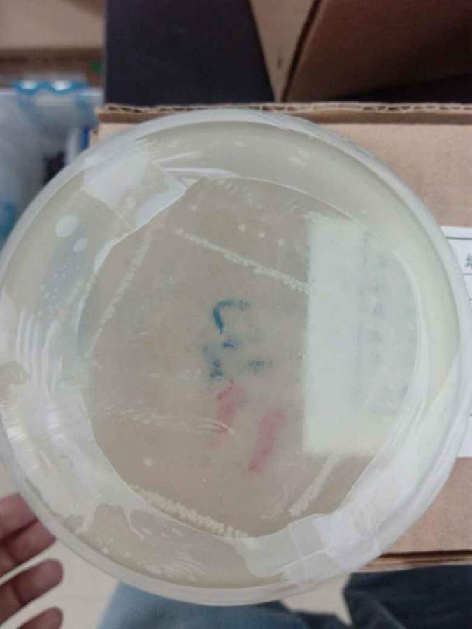忽略培养皿中黄色的大点肯定是染菌了,大肠杆菌应该是白色光滑的,现在旁边出现了一圈白色的东西,就像多了一圈“蛋白”一样,然后接种培养能够使液体培养基变混浊,但是液体培养基上再转接到固体培养基上就长不出细菌了,这个在冰箱里放的时间有两个多月了吧,是否因为染菌了而不能识别Lb培养基,或者是细菌衰老了活力不够了长不出来了呢?希望得到大家的帮助,谢谢啦~ 发自小木虫Android客户端 |
