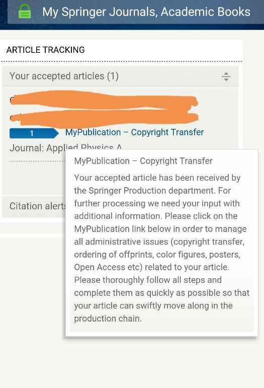 文章录用了,按照要求完成了相关的步骤,也收到了copyright transfer statement邮件,和订购期刊电子版和纸质版的confirmation邮件。。。但是在个人账户里有个article tracking的功能,一周多了一直停在第一步copyright transfer。。 请问有这个期刊投稿经验的前辈,还需要自己做什么步骤吗?我自己找了很久没发现其他需要能继续操作的链接。。 发自小木虫Android客户端 |