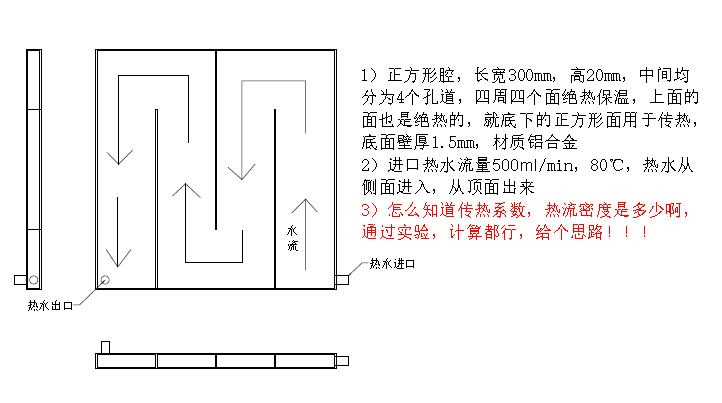 1)正方形腔,长宽300mm,高20mm,中间均分为4个孔道,四周四个面绝热保温,上面的面也是绝热的,就底下的正方形面用于传热,底面壁厚1.5mm,材质铝合金 2)进口热水流量500ml/min,80℃,热水从侧面进入,从顶面出来 3)怎么知道传热系数,热流密度是多少啊,通过实验,计算都行,给个思路!!! 捕获.PNG |