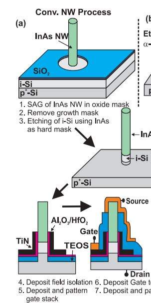 各位大虾,在下近读一篇文章,看到一个纵向的纳米线器件如下图所示(附论文),对于其中工艺步骤有些不明白 ,而文章并无明确阐述。在下一向做理论工作,没有做过实验,所以对于工艺如同文盲,望各位赐教! ![]() ![]() ![]() 疑问: 1. 纳米线侧面的栅介质和栅金属是如何生长上去的? 2.如何保证在生长栅介质和金属的时候保证InAs NW上不生长介质与金属? |