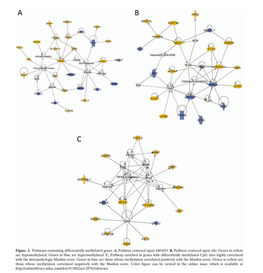 IPA revealed that many differentially methylated genes are present in networks known to be involved in OA. The first network identified centered on SMAD3 (itself hypomethylated in our assay), which functions in a highly correlated manner with TGF to maintain articular cartilage (45) (Figure 3A). A second network included the aforementioned NFATC1, HTRA1, and DLX5. Akt was central in this network, which upregulates MMP production through hypoxia-inducible factor 2 and NF-B and contributes to OA pathology (Figure 3B) (46). Both of these networks demonstrate likely indirect effects of differentially methylated genes on known OA effector pathways