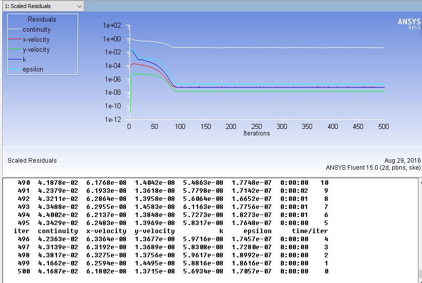 我做的是最简单的一个模拟,模拟2D管道,风从左边口进,右边口出,用gambit画图,管道长5m,宽0.8m,划分网格的时候长宽都是按照interval size为0.04,然后生成面网格,速度进口,压力出口,导入fluent,选择k-e模型,进出口设置,然后迭代500次以后其他都收敛,就连续性方程,不收敛,这该怎么办啊?求大神解答 in.png 3.png 500times.png |