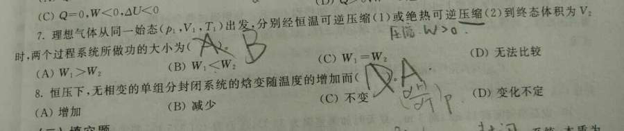 第7题,压缩过程中我觉得应该表述为“系统得到的功”,但是题目要比较的是“系统所做的功”,比较的时候要加负号? 第8题,问的应该就是热容,但是ΔCp一定为正值吗? 发自小木虫Android客户端 |