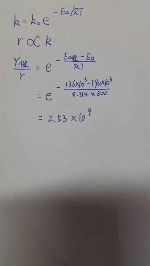 在300K时,反应CH3CHO→CH4+CO的活化能为190KJ/mol. 当加入催化剂后,反应的活化能降低为136KJ/mol. 问加入催化剂后的反应速率是原来的几倍? 发自小木虫Android客户端 |