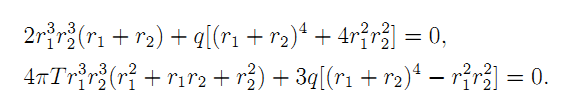 参数 T>0,q<0,以及 r_1 和 r_2 满足如下方程组: