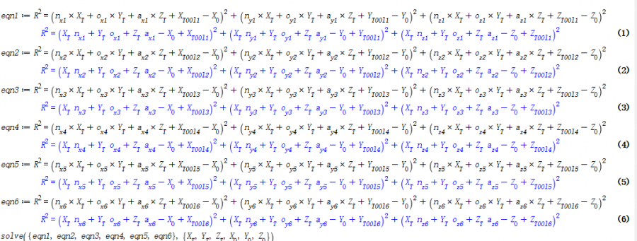 在机器人标定过程中,需要接一个下列的方程组,不知道采用什么方法求解?其中有六个未知数(X0,Y0,Z0,Xt,Yt,Zt),剩下的都是已知数,在Maple中输入下列方程组,一直显示在运行中,也没有算出结果来,求大神帮忙解答(能给出详细的计算过程更好,拜托啦)! 方程组.png |
