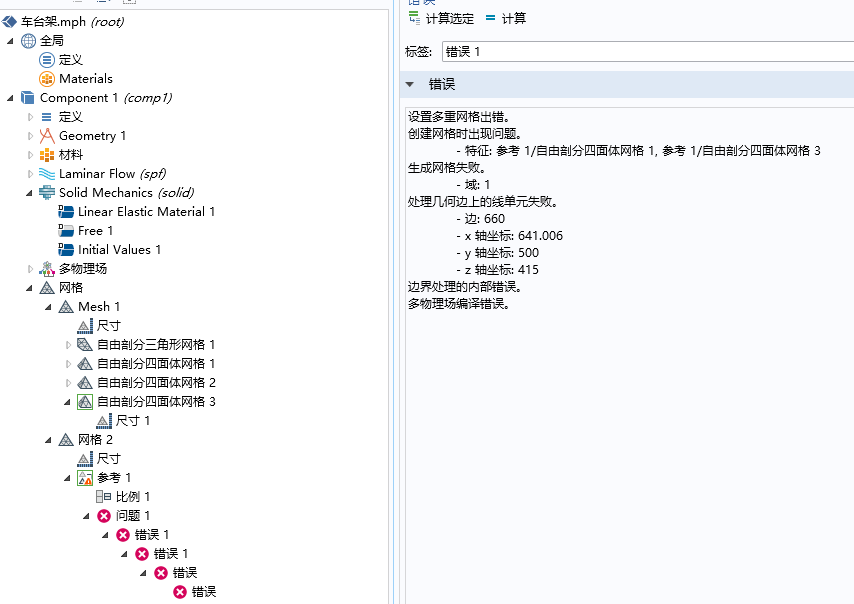 用comsol5.0做一个水下模型车台架的流固耦合仿真,物理场控制网格划分总是出错,所以才用手动剖分网格,对各个域分别画网格,画网格的过程没有出错,但是在瞬态研究点击计算是却显示一个错误(见附件),说是设置多重网格出错,边界处理的内部错误,试着修改调整了多次都没有解决,源文件已上传到附件,还请各位大神帮忙指点指点,感激不尽。 27`P$AQ]9}SR0I$APJ3@IX0.png |
