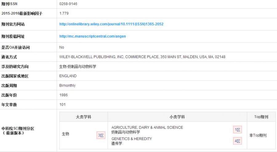 | Animal Genetics 属于几区, 大分区 和 小分区 分别属于几区 |