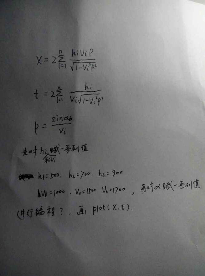 在matlab中建立一个m文件格式如下: function [x,t] = xt(alpha) alpha = alpha/180*pi; h1 = 500; h2 = 700; h3 = 900; v1 = 1000; v2 = 1500; v3 = 1700; h = [h1,h2,h3]; v = [v1,v2,v3]; n = length(alpha); for k = 1:n p = sin(alpha(k))/v; x = 2.*sum(h.*v.*P./sqrt(1-v.^2.*p.^2)); t = 2.*sum(h./(v.*sqrt(1-v.^2.*p.^2))); end 然后在命令窗口输入: alpha = 0:10:180; [x,t] = xt(alpha) plot(x,t,'b','linewidth',3); 这样就能够画出你所需要的曲线图形了 |