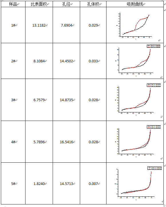 1 你用的孔径是平均孔径吧,如果这样的话,平均孔径,多点BET比表面积,总孔体积的关系是:平均孔径=4*总孔体积/多点BET比表面积,所以一般情况下,如果总孔体积相同的话,孔径越大,孔壁越少,比表面会越小。 2 既然你都说了材料属于介孔材料,那应该华为IV型才对,II型属于非多孔材料。这是否和你第一点说的有点矛盾? 我觉得,这个5个样品如果测试结果没有问题的话,基本是可以认为没啥孔的,所以去分析他的孔分布意义不大。 此外硬要说他们有孔,也是很少很少,分析的孔径的话,用BJH吸附支分析即可。不要去看平均孔径,那个基本没有意义的。 回滞环的产生我觉得是材料颗粒之间的间隙孔造成的。颗粒越大形成的间隙孔越大,孔体积会越大些。颗粒越小,致密性越好,孔体积会小些。 |