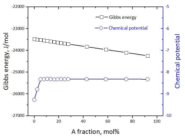 各位朋友大家好,小弟没有学过物理化学,但是碰到了自由能和化学势的问题,有个地方不明白,还请各位指点。 首先材料C是由A和B构成,我查到了不同A含量对应的材料C的Gibbs自由能,温度和压强均不变,那么A的化学势是否就是自由能对A的含量的求导? 如果不是,还请各位教教小弟用什么思路进行求解,谢谢。 吉布斯自由能与化学势.jpg |