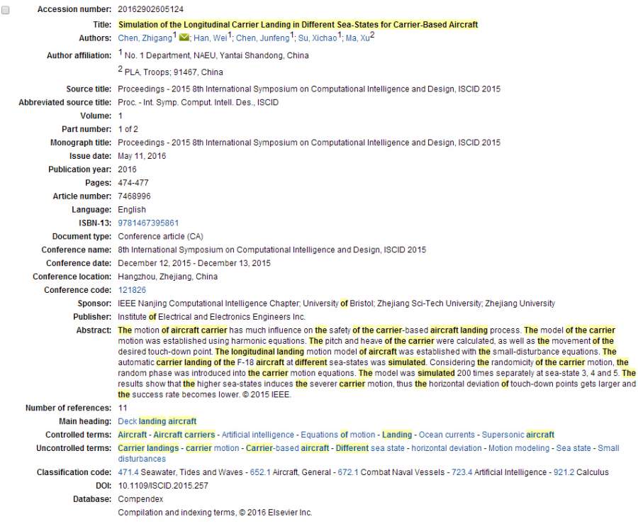 Simulation of the Longitudinal Carrier Landing in Different Sea-states for Carrier-based Aircraft Zhigang Chen, Wei Han, Junfeng Chen, Xichao Su, Xu Ma ISCID2015 发自小木虫Android客户端 |