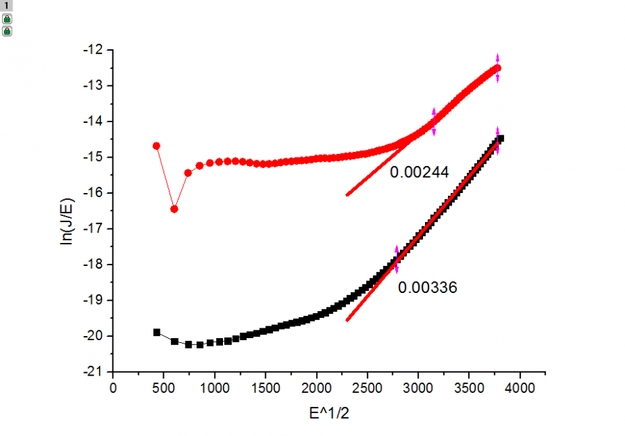 机制的公式如下图,文献中做ln(J/E)-E^1/2 得到斜率,然后进一步得出介电常数ε,但是我怎么算都得不到他这个结果4.4,而且我的计算过程也是如此,得到的介电常数很小,有点low的问题自己实在想不通了,请哪位大神帮看看。不胜感激 文献中结果.png 我的计算.png |