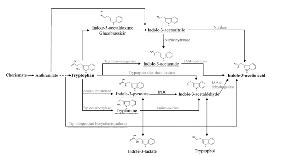以色氨酸为底物,其中有一个酶----是色氨酸酰基转移酶。怎样在它的催化下最终生成IAA生长素。查文献发现有许以色氨酸为底物转化为IAA的条途。当然,这个色氨酸酰基转移酶有可能是其中一条途径的一格酶,或者是其他一个未知的途径。大家看看有没有建议,给我讲解一下。谢谢大家了 已知合成途径PNG |