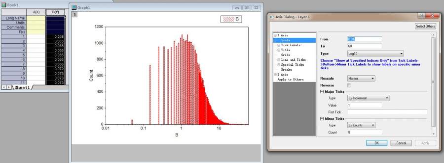 本人小白,求教给位大神,数据是仪器直接检测到的粒径,我放在Origin里面B(Y)栏里,直接用统计做的图,把横坐标改成log10了。这图做出来怎么看怎么感觉不对,前面好稀疏,后面好密集。 请问能不能做成第二个图给出的效果啊? 我做出来的结果 我希望得到的样子(别的数据) |