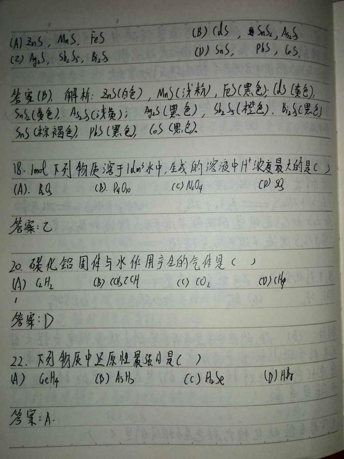18.A,B排除,原因它们的一级电离常数太小了 C,1mol四氧化二氮生成1.33mol硝酸和0.67mol一氧化氮,氢离子浓度为1.33 D,1mol三氧化硫和水生成1mol硫酸,但是由于硫酸的二级电离常数在常温下为0.012(你可以再查查具体为多少),计算得出1mol硫酸的氢离子浓度约为1.01 以上都是忽略溶液体积变化 20.碳化铝在水溶液中铝结合氢氧根离子,碳结合氢离子,所以生成甲烷 22.四种气态氢化物,都是同一周期,其对应元素的金属性越大,还原性越高,所以是氢化锗 发自小木虫Android客户端 |