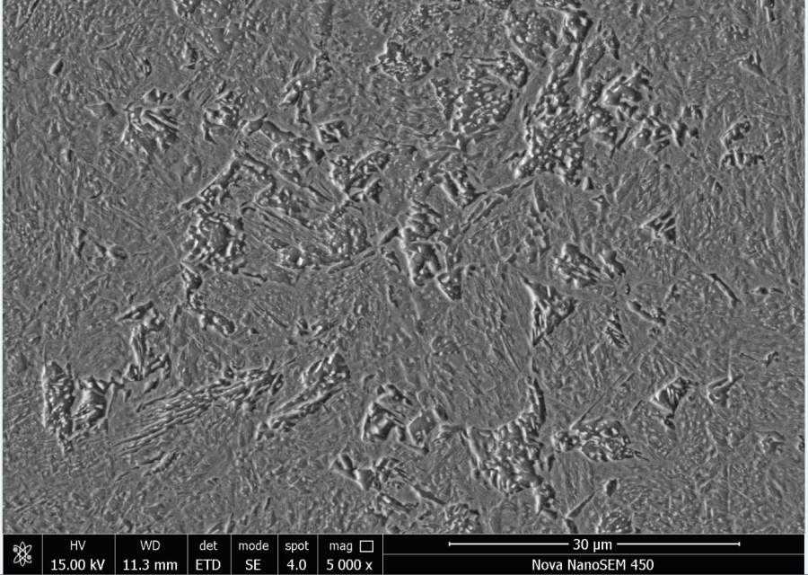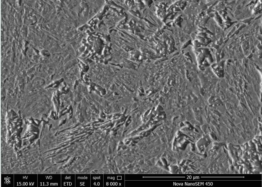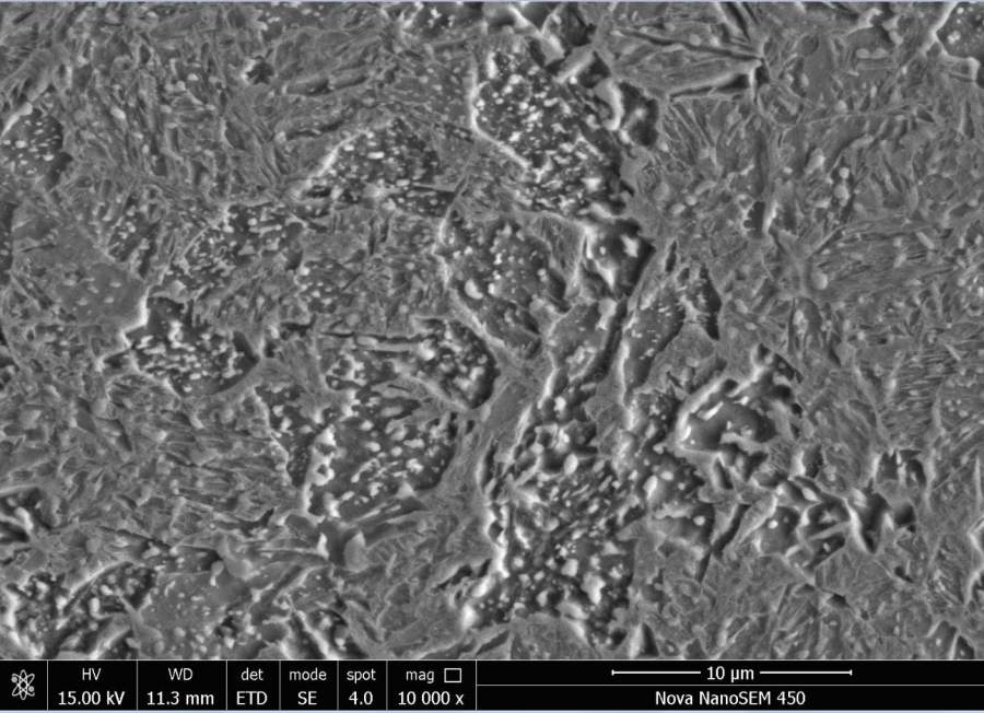 材料55CrMo钢,热处理工艺为加热速度50℃/s,温度850,保温8s,冷却速度50℃/s,这是扫描形貌,凸起的都是分别是神魔,能不能帮忙区分是什么组织,材料的Ac3点781℃,谢谢了! 图片4.jpg 图片5.jpg 图片6.jpg |