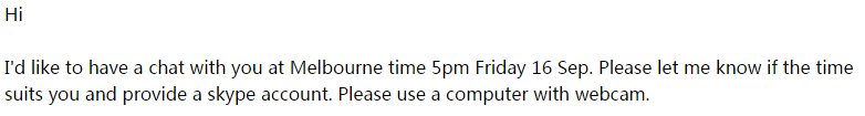 今天给一个墨尔本大学的教授发了一封申请信,他说要周五和我聊一聊,我好紧张,第一次啊! 他是一个华人,本科是清华的,视频的时候一般用英文还是中文呀??? 有经验的人知道第一次视频一般会问些什么?视频的时候有哪些需要注意的地方? 回复邮件下图: 捕获.PNG |