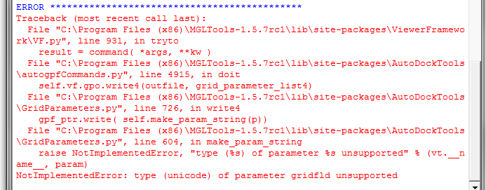 各位大侠,晚辈最近在用AutoDock进行蛋白质和小分子的对接,问题重重。 Autodock Gridbox设置参数后保存为gpf 文件是提示错误(如图),急求求前辈赐教。 PS: Grid Options中Center Grid Box选择为蛋白的中心,其他参数为默认。 BSA参数设置.png Python Shell窗口提示错误.png |