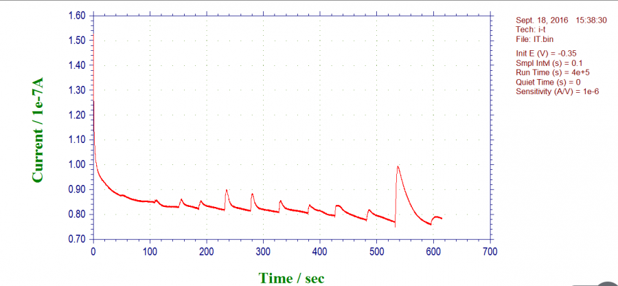 用的上海辰华的电极,在扫描时间电流曲线时,进行了搅拌,尝试多次,都是有这样下降的趋势,出一个峰下降一点,这怎么办,什么原因造成的或者怎么解释呢,该如何改进,谢谢。