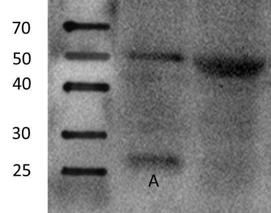 利用BiFC实验的烟草叶片提取总蛋白,进行CO-IP实验,BiFC已证实蛋白之间可以互作。WB时anti-Myc mAb作为一抗,结果如图,泳道2为CO-IP产物,泳道3为总蛋白,A蛋白大小约为23kDa,互作蛋白B约为20kDa。 请教各位,1:是否可以通过此图说明蛋白A和B可以互作; 2:总蛋白WB为什么只有一条带,可能什么原因? 非常感激各位的帮助! Picture1.jpg |