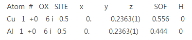 *data for ICSD #150111 Coll Code 150111 Rec Date 2006/04/01 Chem Name Aluminium Copper Lithium (6.66/3.33/3.33) - T1 Structured Al6.66 Cu3.33 Li3.33 Sum Al6.66 Cu3.33 Li3.33 ANX N3O4P6 D(calc) 3.47 Title Refinement of the crystal structure of hexagonal Al2 Cu Li Author(s) van Smaalen, S.;Meetsma, A.;de Boer, J.L.;Bronsveld, P.M. Reference Journal of Solid State Chemistry (1990), 85, 293-298 Unit Cell 4.954(3) 4.954(3) 9.327(4) 90. 90. 120. Vol 198.24 Z 1 Space Group P 6/m m m SG Number 191 Cryst Sys hexagonal Pearson hP13 Wyckoff i e2 d c R Value .087 Red Cell P 4.954 4.954 9.327 90 90 120 198.237 Trans Red 1.000 0.000 0.000 / 0.000 1.000 0.000 / 0.000 0.000 1.000 Comments The structure has been assigned a PDF number (calculated powder diffraction data): 01-072-9692 X-ray diffraction from single crystal Atom # OX SITE x y z SOF H Cu 1 +0 6 i 0.5 0. 0.2363(1) 0.556 0 Al 1 +0 6 i 0.5 0. 0.2363(1) 0.444 0 Al 2 +0 2 c 0.3333 0.6667 0. 1. 0 Al 3 +0 2 e 0. 0. 0.3568(7) 1. 0 Li 1 +0 2 d 0.3333 0.6667 0.5 1. 0 Li 2 +0 2 e 0. 0. 0.051(9) 0.666 0 *end for ICSD #150111 |
