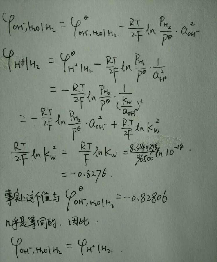 通过查电极电势表,298K时,标准氢电极电势与碱性氢电极标准电势是不同的,但是当我计算非标准氢电极电势时,298K下,酸性氢电极和碱性氢电极的电极电势是相等的。由于缺少数据,无法计算其他温度下两种氢电极的非标准电极电势,但是分析后,作出了一个假设: 在任何温度下,碱性氢电极与酸性氢电极的标准电势不相等,但是它们的非标准电势是相等的。 这个假设是否正确? 发自小木虫Android客户端 |