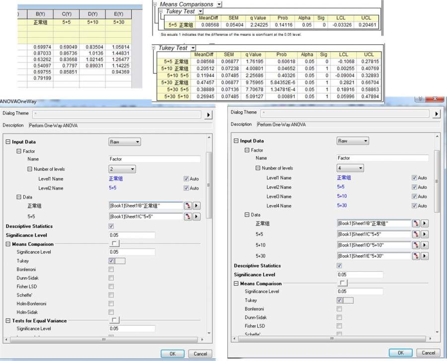 五组数据,用Origin做One-way ANOVA分析比较均值差异性。