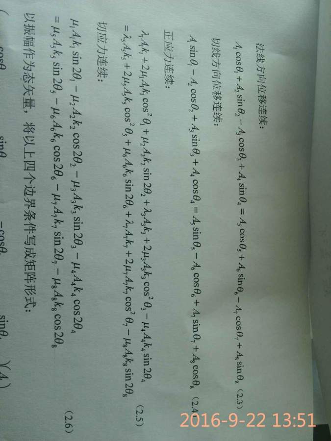 诸位虫友,我在看一维声子晶体的转移矩阵法,里面 有B,A之间界面上纵波和横波的法线和切线方向的位移连续以及正应力和切应力连续,即图片上的公式2.3,2.4,2.5,2.6,我实在是不明白啊。希望有虫友能指教一下,或者相关的参考资料,我当以金币谢之。 发自小木虫Android客户端 |