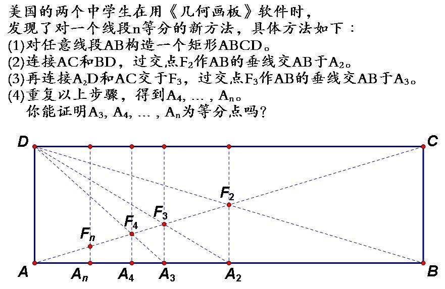 不难证明,例如,可证明A3是三等分点,只需证明F3A3/CD=1/3。很明显,用相似,三角形AF3A2与三角形CF3D相似求出AF3与AC的关系(1比3的关系),即可。