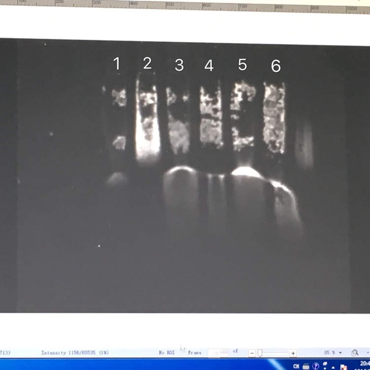 最近刚刚开始学习做EMSA,曝光之后如图,1,3,5泳道为三种不同探针的实验组,2,4,6泳道为这三种探针的阴性对照组。生物素标记,蛋白量为4μg,探针量没计算。电泳85v,50min。转膜380mA,40min。 转膜后把尼龙膜截下来时,发现上样的泳道上有少量的胶附着,无法去除。曝光之后如图,泳道上有这样的一条带,而且下面的探针很弥散。不清楚什么原因,求指点。 这种情况是不是就排除了蛋白和这三种探针结合的可能呢? 实验要如何改进呢? 还有,我没有用x光片曝光的方法,而是采用成像系统直接积分扫描的照片。 @biostar2009 @飞约疯人院 @wizardfan @youlinglyw 发自小木虫IOS客户端 |