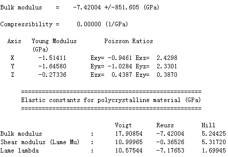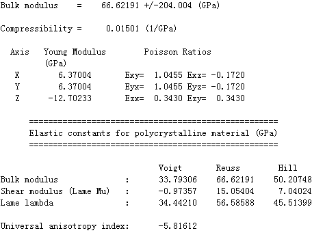 如下图,是我计算的两种晶体的弹性模量计算结果,有几点疑问,不知道怎么分析?1,弹性模量分xyz三个方向,需要分别分析三个方向的弹性模量值吗?2,计算出的弹性模量值存在负值?是计算错误还是表示方向问题呢?3,弹性模量的大小与构建的模型大小没有关系吧?弹性模量值越大,表示晶体越稳定对吗? 麻烦懂的人回答一下吧,初学什么都不懂,金币送上,谢谢! hex.png tri.png |