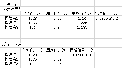 我近期正在测若干份桑叶中总黄酮的含量,用乙醇提取,用硝酸铝比色法测定。每份桑叶材料平行提取3份,得到3份桑叶总黄酮提取液;每份桑叶总黄酮提取液平行检测2次;这样每份桑叶材料,经检测得到6个数据。这6个数据,我是先将每份测定液的2个测定值求平均值,得到3个平均值,然后对这3个数据求标准偏差?还是直接对这6个数据求标准偏差?或者还有没有其它的求标准偏差的方法? 如下图数据,哪种方法是正确的呢? 桑叶总黄酮数据分析.png@鸭绿江畔@superyeast@wyy080214@klicking@学术巨星 |