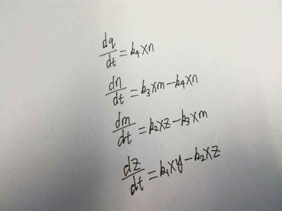 如图所示方程组,其中x y z m n q都是t的函数,k1 k2 k3 k4为常数。怎么可以解出方程组的解析解啊?跪求大神帮忙~~ 发自小木虫Android客户端 |