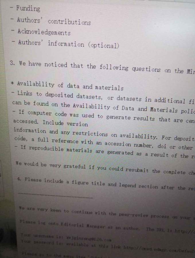 3. We have noticed that the following questions on the Minimum Standards of Reporting Checklist have not been answered: * Availability of data and materials - Links to deposited datasets, or datasets in additional files, should be explicitly referenced in a section entitled “Availability of Data and Materials”. Guidance on where to deposit your data can be found on the Availability of Data and Materials policy page. - If computer code was used to generate results that are central to the paper’s conclusions, include a statement in the “Availability of data and materials” section to indicate how the code can be accessed. Include version information and any restrictions on availability. For deposited data and published code, a full reference with an accession number, doi or other unique identifier should be included in the reference list. - If reproducible materials are generated as a result of the research (for example new animal mutants), a statement on their availability should be included. 这个怎么处理啊?怎么传,同类的文章,他们是传到NCBI里面,怎么传过去?论文要求上传数据,是自己做实验的原始数据吗?全部传他们能保密吗?还有用的是中文的记录方法,可以吗? 发自小木虫Android客户端 |