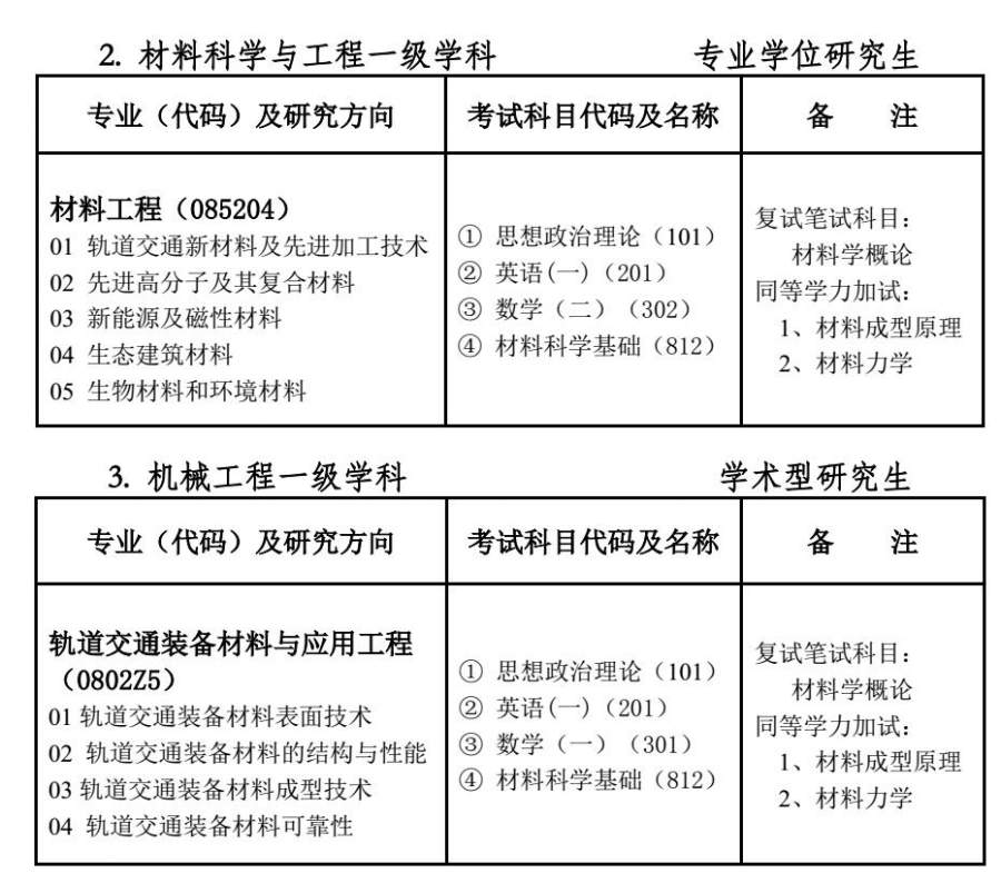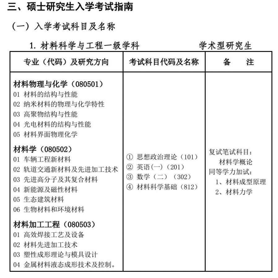 欢迎报考兰州交通大学材料类专业硕士研究生 兰州交通大学材料类专业依托本校机电工程学院及材料工程系办学。拥有“轨道交通装备材料与应用工程(0802Z5)”二级学科博士学位、硕士学位和“材料科学与工程”一级学科硕士学位授予权。“材料科学与工程”学科是甘肃省重点学科,具有材料物理与化学(080501)、材料学(080502)和材料加工工程(080503)3个二级学科学术型硕士研究生和“材料工程”专业学位(085204)工程硕士培养资格。 培养的研究生主要在轨道交通、装备制造、冶金、化工、工程建设等领域从事产品生产、材料制备及工艺设计、材料改性、新材料开发、材料分析检验、材料成型设备开发等工作,或在高校从事教学和科学研究工作。 一、研究生指导队伍 现有专职教师20人,其中教授5人(冯利邦,王彦平,徐卫军,王顺花,耿中荣),副教授8人(郑韶先,王新伟,徐立新,强小虎,黄大建,褚克,张媛,刘艳花),高工1人(杨妹娟),讲师6人。其中博导1名,硕导11名,研究生指导教师的具体信息参见: http://jdxy.lzjtu.edu.cn/?page_id=291。 材料科学与工程学科现有两个研究生指导团队,具体情况如下: (一)“轨道交通新材料与表界面技术”团队 指导老师:冯利邦(带头人),王彦平,强小虎,徐卫军,徐立新,黄大建 相关科研团队: (1)轨道交通新材料与表界面技术:冯利邦,王彦平,强小虎,刘艳花,史雪婷 (2)材料改性与复合新技术:徐卫军,徐立新,黄大建,周富涛 (二)“金属材料与功能材料”团队 指导老师:王顺花(带头人),郑韶先,王新伟,耿中荣,褚克,张媛 相关科研团队: (1)焊接技术及零部件失效分析(高性能金属结构材料与高效焊接技术):王顺花,郑韶先,赵锡龙,李芳红,孟倩 (2)新能源与功能材料:王新伟,耿中荣,褚克,张媛,杨妹娟,韩兴瑞 二、研究生招生专业介绍 (一)材料物理与化学(080501) “材料物理与化学”是材料科学与工程一级学科所属的二级学科,是一门以数学、物理和化学等自然科学为基础,应用现代物理与化学研究方法和模拟计算技术,从分子、原子、电子等多层次上研究材料的物理、化学行为与规律的学科,探索材料组成-结构-性能之间的内在关系,实现材料的可控合成与制备,致力于先进材料与相关器件的研究开发,揭示材料物理本质及其演变规律,为材料的微结构设计、性能预测及制备工艺优化与合理使用提供科学依据。本学科主要培养具有坚实的材料物理化学基础理论和系统的材料物理化学专门知识、能够从事材料科学相关的教学、基础研究、材料生产与应用和新材料开发等工作的人才。 主要研究方向:材料的结构与性能,纳米材料的物理与化学特性,高聚物结构与性能,光电功能材料,材料界面物理化学。 (二)材料学(080502) “材料学”是材料科学与工程一级学科所属的二级学科,是一门实用性较强的应用基础学科,它既要探讨材料的普遍规律,又有重要的工程应用价值。本学科主要研究材料的组成、结构、加工、性质和使用性能之间的相互关系,为材料的设计、制造、工艺优化和合理使用提供科学依据。本学科主要培养掌握材料科学与工程学科扎实的基础理论与系统的专业知识,了解本学科的进展和发展动向,具备从事材料科学与工程领域的科学研究、教学工作和其它专业技术工作能力的高层次人才。 主要研究方向包括:机车车辆新材料,轨道交通新材料,先进高分子及其复合材料,新能源及磁性材料,功能界面材料,生物材料和环境材料。 (三)材料加工工程(080503) “材料加工工程”是材料科学与工程一级学科所属的二级学科,是以金属学、弹塑性力学、机械、自动控制等为理论基础的交叉学科,是研究控制材料的外部形状和内部组织结构,以及将材料加工成人类社会所需求的各种零部件及成品的应用技术的学科。本学科主要培养掌握材料制备方法、成形加工工艺、成形过程控制方法、材料组织与性能间的关系、成形设备及其控制等专业知识、具有开拓精神和国际化特点的高层次工程技术人员和开展本学科领域前沿课题的研究的专门人才。 主要研究方向:高效焊接工艺及设备,轨道交通新材料及先进加工技术,塑性成形理论与模具设计,金属材料液态成形技术及控制。 (四)材料工程(085204) “材料工程”为材料科学与工程学科专业学位硕士研究生培养专业,培养掌握材料工程领域坚实的基础理论和宽广的专业知识,掌握解决材料工程问题的先进技术方法和现代技术手段,工程实践能力强并具有一定创新能力、能够独立担负工程领域专业技术和工程管理工作的人才。 本工程领域主要研究方向包括:轨道交通新材料及先进加工技术,功能纳米界面材料与表面防护技术,高性能结构材料的制备与成型技术等。 (五)轨道交通装备材料与应用工程(0802Z5) “轨道交通装备材料与应用工程”是机械工程一级学科所属的二级学科,该学科以轨道交通装备用材料为研究对象,为新兴的交叉学科,涉及机械、材料、物理、化学和表面工程等多个学科领域。其学科内涵就是研究现代轨道交通装备服役条件下材料的结构、性能与应用的基本理论,探索满足轨道交通装备性能要求的新材料及其应用特性。本学科主要培养具有扎实基础知识与实践能力、具备现代轨道交通装备材料设计与研发能力及良好的职业素质与创新能力的应用型、复合型高素质优秀人才。 主要研究方向为轨道交通装备