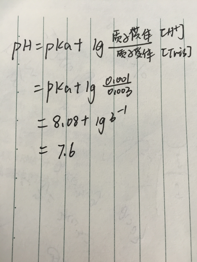 混合后,形成2mmol tris和1mmol trisCl的混合物 pH=pKa+lg(2mmol/1mmol)=pKa+lg2 好久没接触了,不知道对不对,具体自行学习 https://yunpan.cn/cka4UAvEC8kIF 基础化学53页,缓冲液pH的计算公式 [ 发自手机版 http://muchong.com/3g ] |