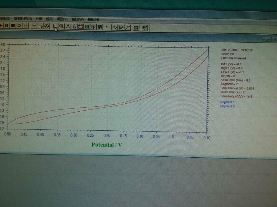 我自己制备的石墨电极,为什么怎么测都是显示的这样,这样会是什么的问题??刚接触这个不是很懂。 发自小木虫Android客户端 |