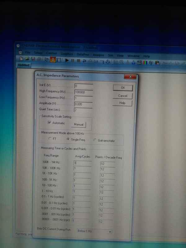 用CHI760E电化学工作站测超级电容器交流阻抗,样品是煤制碳材料,电解液为3MKOH,参比电极AgCI,对电极Pt,请教请教大神们,下图中的参数应如何设置,或者依据什么来设置?感激不尽! 发自小木虫Android客户端 |