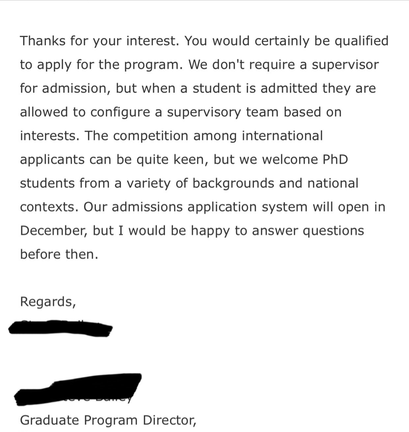 求教 套瓷很快得到回复,但得到模板回复怎么继续套,怎么回复。大意是我有资格参加那个program,让我开放之后去申请。但他们在录取之前不要求有supervisor。喜欢不同国家背景的appliants,但他在开放之前很乐意回答我的问题。 大写的模板回复,隔一天我就收到回复了。觉得貌似可以强行继续套,不想放弃。因为是 graduate program director n perfectly matchs my interests and major.第一封是be guided 但没有第二封怎么套。毕竟要看pro怎么回复。求指点第二封,因为回复太快了,以至于给我指导的我还不能借鉴。 发自小木虫IOS客户端 |