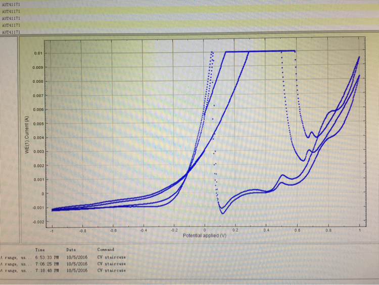 请问各位大神,用瑞士万通电化学工作站扫循环伏安图时,当电流到0.01A的时候就出现平行线,取不到数据,这个是怎么回事?
