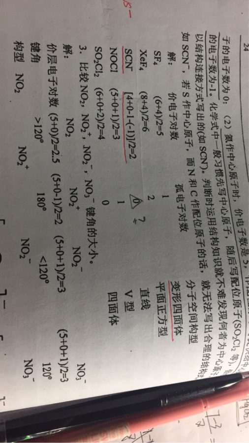 C为中心原子,提供的价电子数为为4,S提供的价电子数为2,扣除形成Π键所需的2个价电子,净提供价电子数为0;N提供的价电子数为3,扣除形成2个Π键所需的4个价电子,净提供价电子数为-1,SCN-带有1个电子,故σ价电 ...