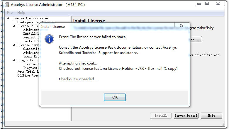 之前把 电脑重装了win7的操作系统,在administrator账号下将MS8.0装在了C盘,并注册成功,利用其中的Dmol3模块进行结构优化计算,正常使用了两个月之后,突然Dmol3模块的calculation不能用了,没办法,只好卸载之后重装,结果总是在license文件安装时出现如图错误,不知有没有虫子遇到这种情况,怎么解决的?谢谢! 捕获.PNG |