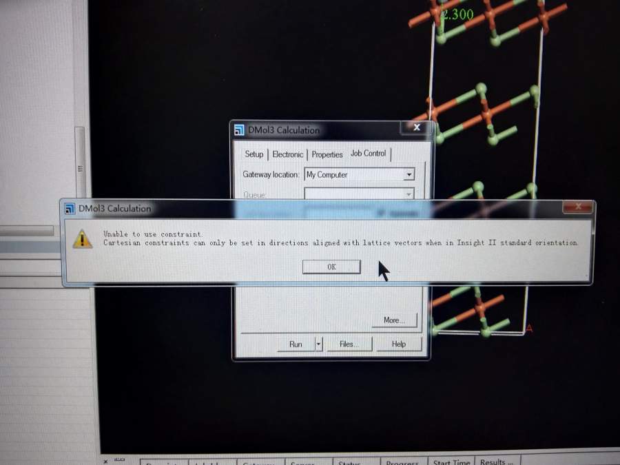表面选用四层模型,最底层全固定,表面三层x,y方向固定,吸附分子不固定,想要用Dmol3模块进行几何优化,但对话框提示计算无法进行,请问我之前的设置出现哪些问题了呢~~望指点~~~~~ IMG_20161006_203119.jpg@月只蓝@beefly |