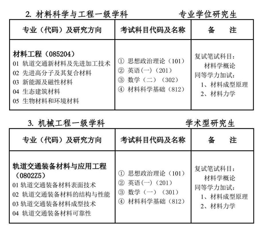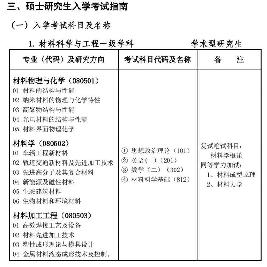 欢迎报考兰州交通大学材料类专业硕士研究生 兰州交通大学材料类专业依托本校机电工程学院及材料工程系办学。拥有“轨道交通装备材料与应用工程(0802Z5)”二级学科博士学位、硕士学位和“材料科学与工程”一级学科硕士学位授予权。“材料科学与工程”学科是甘肃省重点学科,具有材料物理与化学(080501)、材料学(080502)和材料加工工程(080503)3个二级学科学术型硕士研究生和“材料工程”专业学位(085204)工程硕士培养资格。 培养的研究生主要在轨道交通、装备制造、冶金、化工、工程建设等领域从事产品生产、材料制备及工艺设计、材料改性、新材料开发、材料分析检验、材料成型设备开发等工作,或在高校从事教学和科学研究工作。 一、研究生指导队伍 现有专职教师20人,其中教授5人(冯利邦,王彦平,徐卫军,王顺花,耿中荣),副教授8人(郑韶先,王新伟,徐立新,强小虎,黄大建,褚克,张媛,刘艳花),高工1人(杨妹娟),讲师6人。其中博导1名,硕导11名,研究生指导教师的具体信息参见: http://jdxy.lzjtu.edu.cn/?page_id=291。 材料科学与工程学科现有两个研究生指导团队,具体情况如下: (一)“轨道交通新材料与表界面技术”团队 指导老师:冯利邦(带头人),王彦平,强小虎,徐卫军,徐立新,黄大建 相关科研团队: (1)轨道交通新材料与表界面技术:冯利邦,王彦平,强小虎,刘艳花,史雪婷 (2)材料改性与复合新技术:徐卫军,徐立新,黄大建,周富涛 (二)“金属材料与功能材料”团队 指导老师:王顺花(带头人),郑韶先,王新伟,耿中荣,褚克,张媛 相关科研团队: (1)焊接技术及零部件失效分析(高性能金属结构材料与高效焊接技术):王顺花,郑韶先,赵锡龙,李芳红,孟倩 (2)新能源与功能材料:王新伟,耿中荣,褚克,张媛,杨妹娟,韩兴瑞 二、研究生招生专业介绍 (一)材料物理与化学(080501) “材料物理与化学”是材料科学与工程一级学科所属的二级学科,是一门以数学、物理和化学等自然科学为基础,应用现代物理与化学研究方法和模拟计算技术,从分子、原子、电子等多层次上研究材料的物理、化学行为与规律的学科,探索材料组成-结构-性能之间的内在关系,实现材料的可控合成与制备,致力于先进材料与相关器件的研究开发,揭示材料物理本质及其演变规律,为材料的微结构设计、性能预测及制备工艺优化与合理使用提供科学依据。本学科主要培养具有坚实的材料物理化学基础理论和系统的材料物理化学专门知识、能够从事材料科学相关的教学、基础研究、材料生产与应用和新材料开发等工作的人才。 主要研究方向:材料的结构与性能,纳米材料的物理与化学特性,高聚物结构与性能,光电功能材料,材料界面物理化学。 (二)材料学(080502) “材料学”是材料科学与工程一级学科所属的二级学科,是一门实用性较强的应用基础学科,它既要探讨材料的普遍规律,又有重要的工程应用价值。本学科主要研究材料的组成、结构、加工、性质和使用性能之间的相互关系,为材料的设计、制造、工艺优化和合理使用提供科学依据。本学科主要培养掌握材料科学与工程学科扎实的基础理论与系统的专业知识,了解本学科的进展和发展动向,具备从事材料科学与工程领域的科学研究、教学工作和其它专业技术工作能力的高层次人才。 主要研究方向包括:机车车辆新材料,轨道交通新材料,先进高分子及其复合材料,新能源及磁性材料,功能界面材料,生物材料和环境材料。 (三)材料加工工程(080503) “材料加工工程”是材料科学与工程一级学科所属的二级学科,是以金属学、弹塑性力学、机械、自动控制等为理论基础的交叉学科,是研究控制材料的外部形状和内部组织结构,以及将材料加工成人类社会所需求的各种零部件及成品的应用技术的学科。本学科主要培养掌握材料制备方法、成形加工工艺、成形过程控制方法、材料组织与性能间的关系、成形设备及其控制等专业知识、具有开拓精神和国际化特点的高层次工程技术人员和开展本学科领域前沿课题的研究的专门人才。 主要研究方向:高效焊接工艺及设备,轨道交通新材料及先进加工技术,塑性成形理论与模具设计,金属材料液态成形技术及控制。 (四)材料工程(085204) “材料工程”为材料科学与工程学科专业学位硕士研究生培养专业,培养掌握材料工程领域坚实的基础理论和宽广的专业知识,掌握解决材料工程问题的先进技术方法和现代技术手段,工程实践能力强并具有一定创新能力、能够独立担负工程领域专业技术和工程管理工作的人才。 本工程领域主要研究方向包括:轨道交通新材料及先进加工技术,功能纳米界面材料与表面防护技术,高性能结构材料的制备与成型技术等。 (五)轨道交通装备材料与应用工程(0802Z5) “轨道交通装备材料与应用工程”是机械工程一级学科所属的二级学科,该学科以轨道交通装备用材料为研究对象,为新兴的交叉学科,涉及机械、材料、物理、化学和表面工程等多个学科领域。其学科内涵就是研究现代轨道交通装备服役条件下材料的结构、性能与应用的基本理论,探索满足轨道交通装备性能要求的新材料及其应用特性。本学科主要培养具有扎实基础知识与实践能力、具备现代轨道交通装备材料设计与研发能力及良好的职业素质与创新能力的应用型、复合型高素质优秀人才。 主要研究方向为轨道交通装备