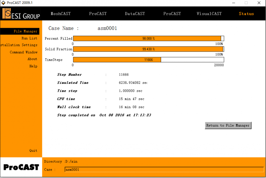 正在学习ProCAST,参数设置按照教程设置的,应该没有问题,设置完后也可以在Status中看到正在计算,但我Visua1CAST的ViewCAST中看不到金属液冲型过程,只有一张静态图片,如图,哪位大神帮我看下是什么问题,谢谢!![]() 截图20161008171012.png 截图20161008171340.png |