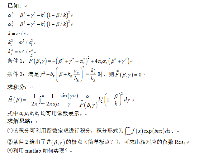在求解Dilichlet内问题时,需要求解一个函数在无穷域上的定积分,需要用到留数定理,由于不是数学专业,东西都是现学现卖,用matlab实现起来到处碰壁,把问题总结如下图所示,希望有论坛大神能够解决~先谢过啦~ 问题描述.png |