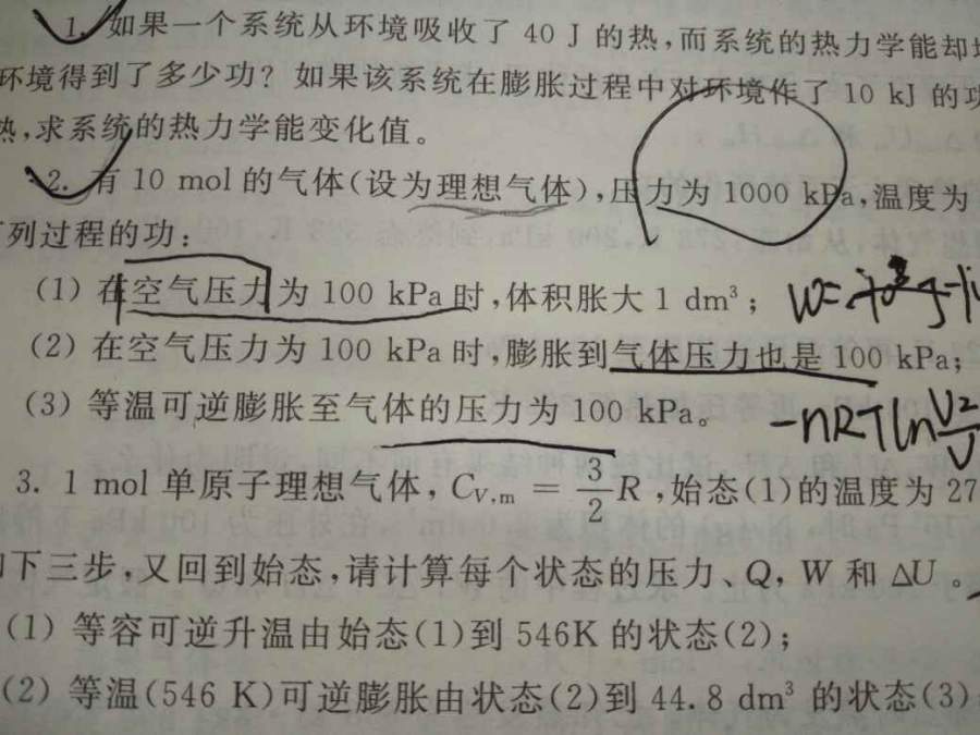 kPa与dm3相对应。更正W=-peΔV=-100*1=-100J......