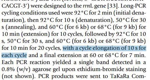 求助各位有没有人知道蓝色是什么意思,我不是很理解每个循环延长10s,这步在PCR机器上如何实现哈?是设置20个单独完整的循环(变性,退火,延伸)每1个循环多延伸10s吗?我看了我们的机器做多只能设置5个变性,退火,延伸这种完整的循环,是不是我理解错了哈? 求助.jpg |