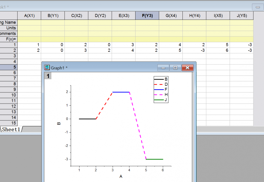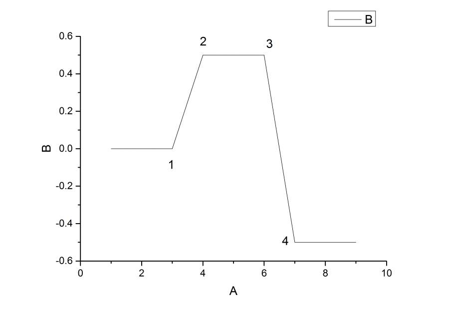 如图所示,想要图中1-2,3-4之间是虚线,3个平台是实线的,origin有什么方法可以实现吗?自己画线不太好找准那个点